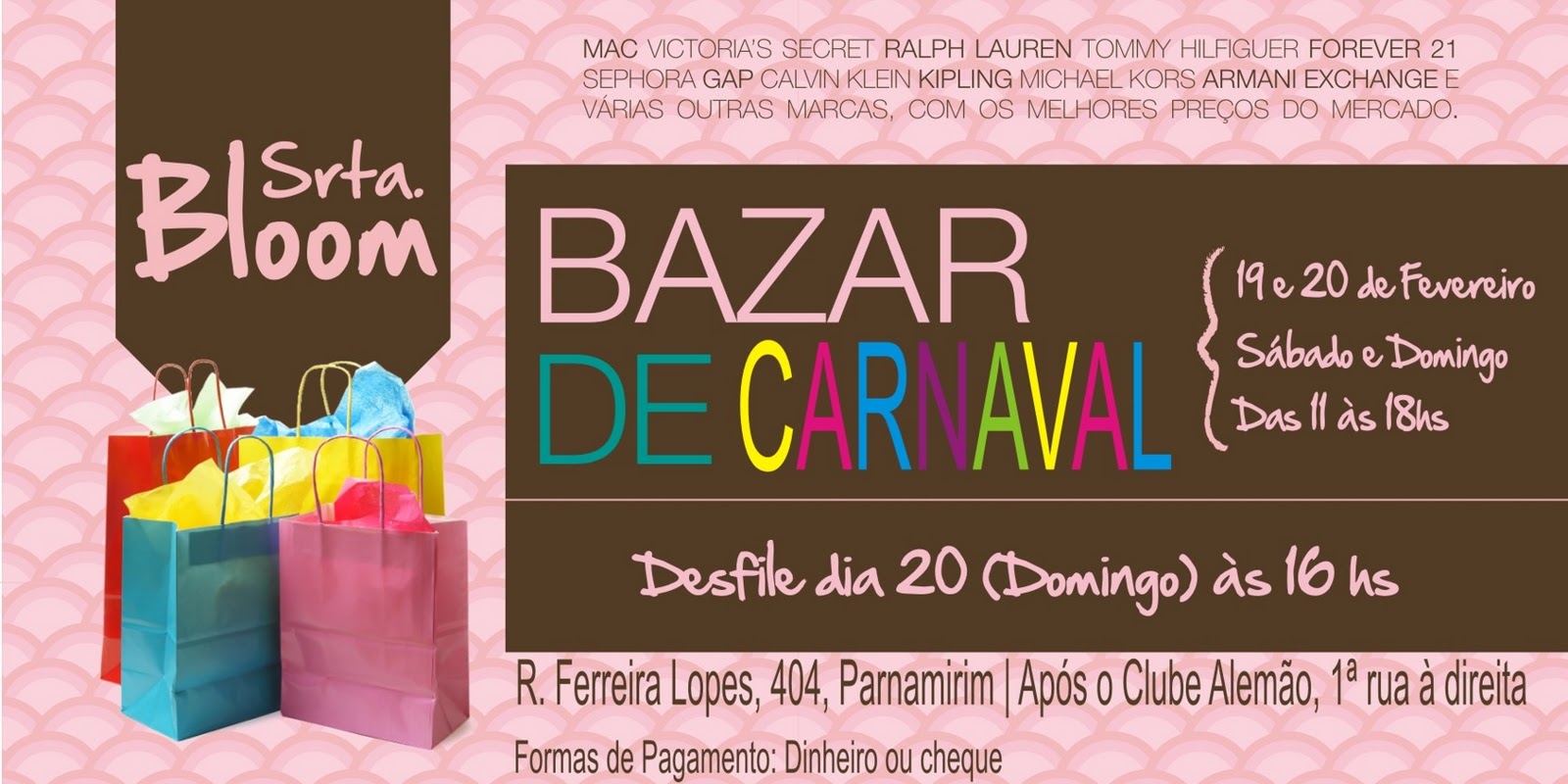 Quem perdeu o Mega Bazar de Natal da Srta Bloom terá uma segunda chance de ver todas as novidades! Nesta quinta-feira (16/12), a partir das 18h, nossas portas estarão abertas na Rua Ferreira Lopes, 404, Parnamirim (primeira rua a direita depois do Clube Alemão)! Roupas lindíssimas masculinas e femininas, relógios Michael Kors de várias cores, bolsas Tommy, Calvin Klein, óculos Armani e Marc Jacobs e muito mais...
